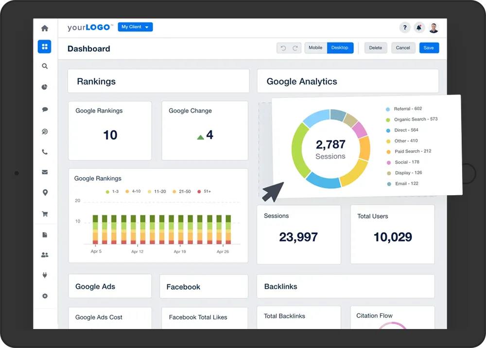 Our powerful client dashboard brings together all the digital marketing metrics that matter most to you in one centralised platform. Easily monitor everything from Social Media performance to Pay Per Click campaigns. Complimentary for our retained clients, and also available via a subscription plan.